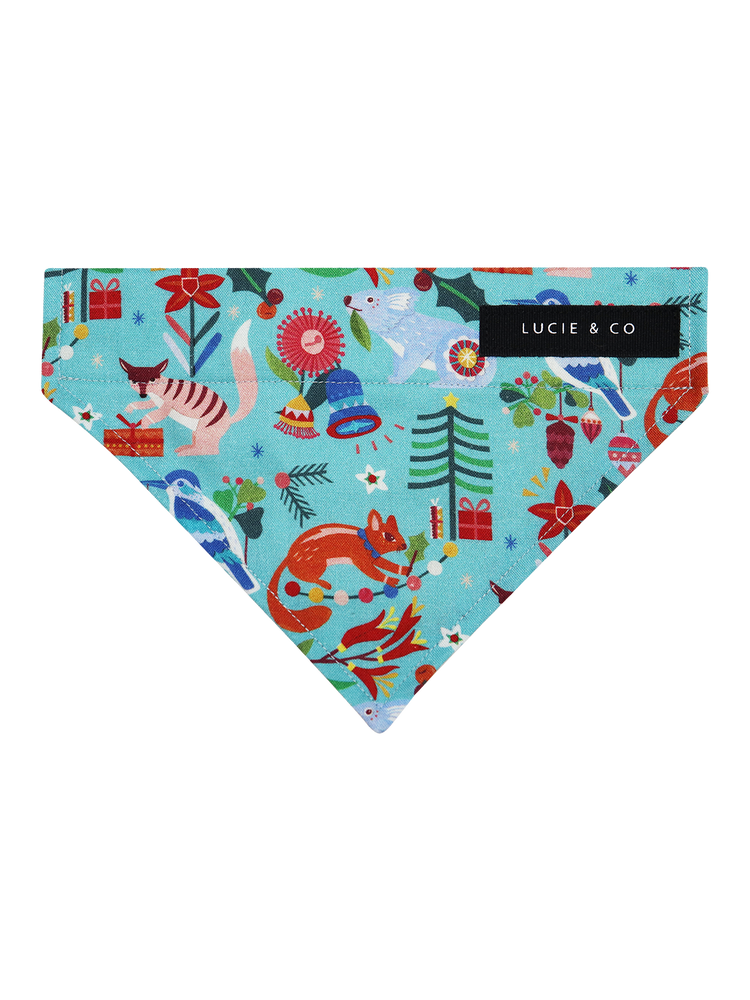 Get ready to embrace the festive cheer with our eco-friendly Merry Menagerie Holiday Pet Bandana. Handmade from sustainable, recycled fabrics, this vibrant and busy fabric is a delightful tapestry of colors, featuring a joyful parade of animals, flowers, and Christmas presents, all set against a backdrop of merry holiday trees. It’s perfect for pet owners who want high-quality products that are kind to the planet.